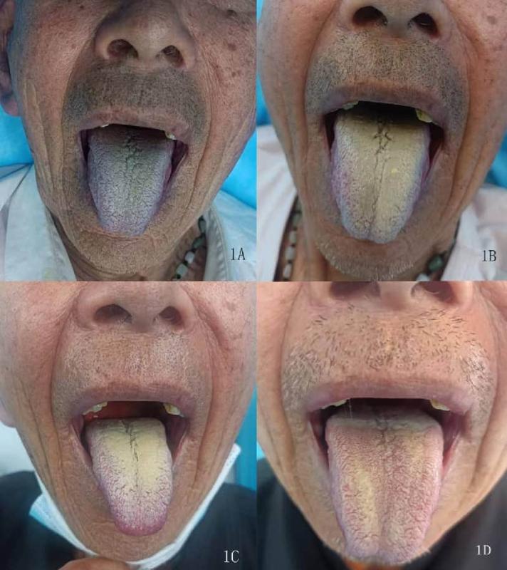 记录了服药前后的舌象变化。A为初诊时的舌象;B为二诊时的舌象;C为三诊时的舌象;D为五诊时的舌象。