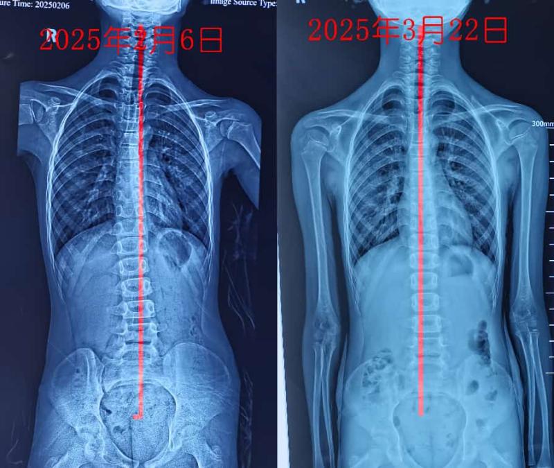 疗效:经系统治疗后,患儿纳食转佳,大便成形。体态明显改善,双肩基本恢复对称。复查X线片(2025年3月22日)示Cobb角减小至约7°(见下图)。